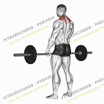 - Stand with your feet shoulder-width apart and hold a barbell in front of you with an overhand grip.