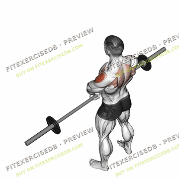 - Stand with your feet shoulder-width apart and hold a barbell with an overhand grip, hands slightly wider than shoulder-width apart.