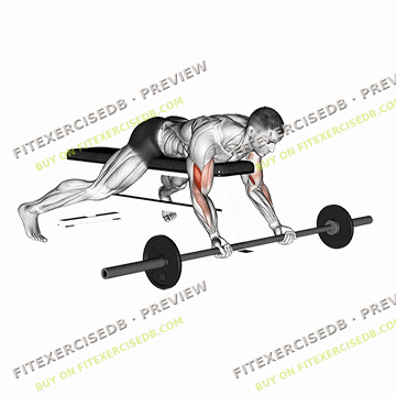 - Sit on a preacher bench with your chest against the pad and your arms extended over the edge, holding a barbell with an underhand grip.