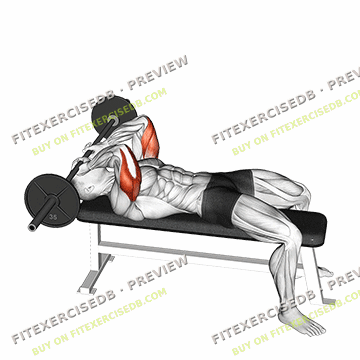 - Keeping your upper arms stationary, slowly lower the barbell towards your forehead by bending your elbows.