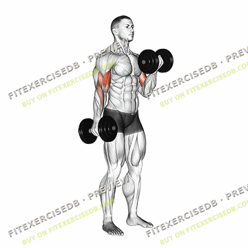 - Continue to raise the dumbbells until your biceps are fully contracted and the dumbbells are at shoulder level.