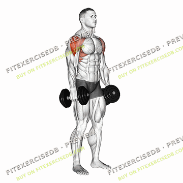 - Stand with your feet shoulder-width apart and hold a dumbbell in each hand, palms facing your body.