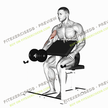 - Sit on a preacher curl bench with your upper arms resting on the pad and your chest against it.