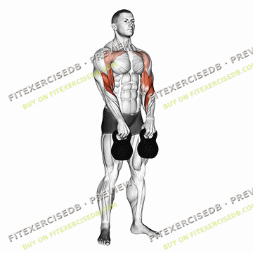 - Stand with your feet shoulder-width apart, holding a kettlebell in each hand with an overhand grip.