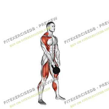- Stand with your feet shoulder-width apart, holding a kettlebell in one hand between your legs.
