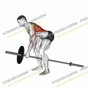 - Stand with your feet shoulder-width apart, knees slightly bent, and hold a barbell with an overhand grip.
