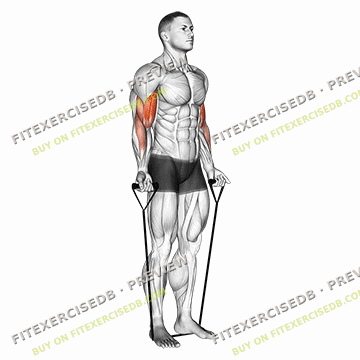 - Stand with your feet shoulder-width apart and hold the band with an underhand grip, palms facing up.