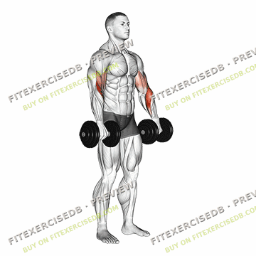 - Stand up straight with a dumbbell in each hand, palms facing down and arms fully extended.