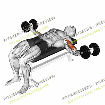 - Lie flat on a bench with a dumbbell in each hand, palms facing up and arms fully extended.