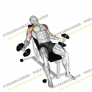- Lie flat on a bench with a dumbbell in each hand, palms facing each other.