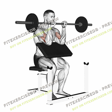 1. Sit on a preacher bench with your chest against the pad and your arms extended straight down, holding a barbell with an overhand grip.