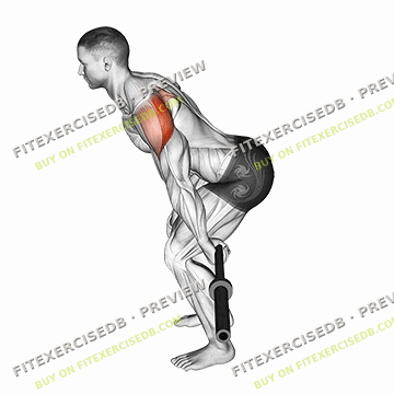 - Stand with your feet shoulder-width apart and hold a barbell in front of your thighs with an overhand grip.