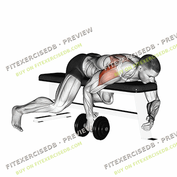 - Lie face down on a flat bench with a dumbbell in one hand, hanging towards the floor.