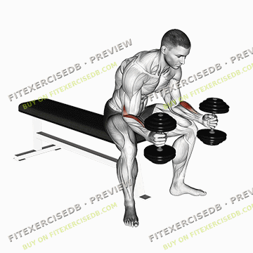 - Sit on a bench with your feet flat on the ground and hold a dumbbell in each hand, palms facing each other.