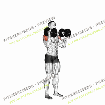- Raise the dumbbells to shoulder height, elbows bent and palms facing forward.