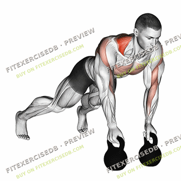 - Start in a high plank position with your hands gripping the kettlebells and your feet hip-width apart.