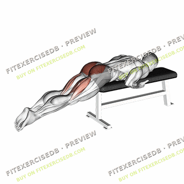- Lie face down on a flat bench with your hips at the edge and your legs hanging off the bench.