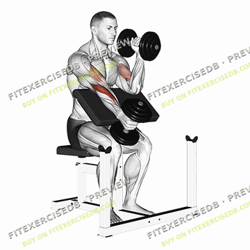 - Sit on a preacher bench with a dumbbell in each hand, palms facing your torso and arms fully extended.
