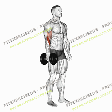 - Stand up straight with a dumbbell in each hand, palms facing your torso.