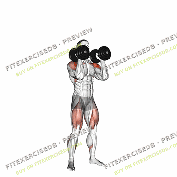 - Stand with your feet shoulder-width apart, holding a dumbbell in each hand at shoulder level.