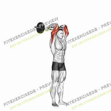 - Keeping your upper arms close to your head, slowly lower the barbell behind your head by bending your elbows.