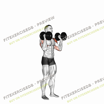1. Stand with your feet shoulder-width apart, holding a dumbbell in each hand at shoulder level with your palms facing inwards.