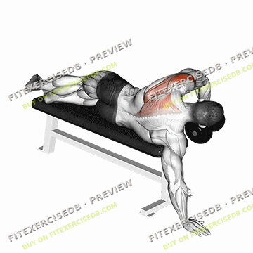 - Lie face down on a flat bench with a dumbbell in one hand, palm facing inwards.