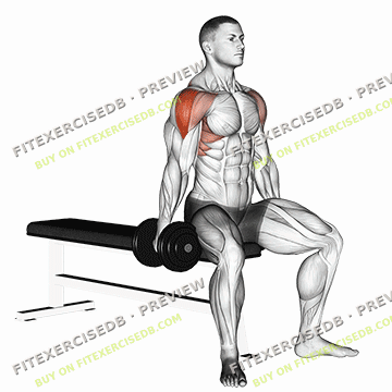 - Sit on a bench with your feet flat on the ground and a dumbbell in each hand, resting on your thighs.