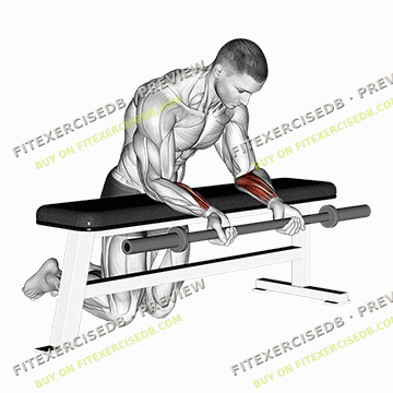 - Sit on a bench with your feet flat on the ground and hold a barbell with an underhand grip, palms facing up.