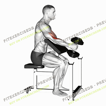 - Sit on a preacher bench with a dumbbell in one hand and your upper arm resting on the pad.
